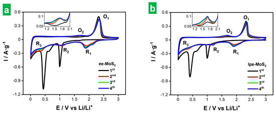 In the second discharge, the peaks associated with Li+ intercalation and LixMoS2 conversion noticed in the first discharge tended to vanish and to shift slightly (peaks denoted as R2 and R3; see Figure 5a,b, red traces). Further, a new peak (R1) appeared at 1.91–1.93 V with a shoulder at ~2.10 V, which shifted to 1.88 V after four cycles. Peaks R1 and R2 were ascribed to the reduction of elemental S back to Li2S [reverse of Equation (6)] and Li-PSs [9,54,59], respectively, although R2 could also arise from some lithiation of restored 2H MoS2 [7,55,56]. In line with the latter, the weak R3 feature would correspond to the conversion of some remaining LixMoS2 material [9,58]. In the second charge cycle, both MoS2 electrodes exhibited a weak feature at ~1.70 V (O2 peak; reactions involving Li-PSs) together with an intense peak at 2.32–2.34 V (O1 peak). All these features then appeared recurrently with little changes in the subsequent CV scans (green and blue traces in Figure 5a,b). We, therefore, conclude that lithium storage in both the ee-MoS2 and lpe-MoS2 electrodes relies on intercalation and conversion reactions, with Li2S/S8 conversion processes very likely playing a main role. Here, the presence of Mo nanoclusters/nanoparticles is thought to be beneficial, as this metal is known to be efficient at immobilizing Li-PSs as well as catalyzing their conversion reactions, thus contributing to alleviating the shuttle issues associated with the Li2S/S8 conversion processes [53,54,60].