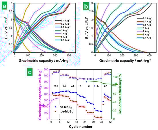 Figure 6a and Figure 6b show representative GCD profiles for ee-MoS2 and lpe-MoS2 electrodes, respectively, measured at different currents. Specifically, each profile is the fifth of five cycles recorded at the same current. They were recorded after the CVs shown in Figure 5 and that is why the capacity associated with SEI formation is absent from them. The corresponding gravimetric capacities for the five GCD cycles (relative to the total mass of the electrode) are plotted in Figure 6c, together with their coulombic efficiency values. As expected, the profiles displayed clear potential plateaus at low currents (e.g., 0.1 and 0.2 A g−1) reflecting the Li2S/S8 conversion processes at ~2.1–2.3 V vs. Li/Li+, although such plateaus were only retained in part at higher currents. Indeed, the shape of the profiles tended to become straight at the highest currents (up to 5 A g−1), such constant variation of potential vs. time indicating increasing contributions of (pseudo)capacitive processes [54,61]. The straight, steep nature of the profiles at increasing currents was also indicative of ohmic polarization, which resulted in capacity losses and was more pronounced for lpe-MoS2 [54]. Ohmic polarization was also reflected in the GCD profiles by a sudden decrease in potential when the sign of the intensity was inverted. When the current density was returned to its starting low value (0.1 A g−1; cyan traces in Figure 6a,b), only a partial recovery of the potential plateaus was observed, implying some irreversibility of the corresponding storage processes. Nonetheless, the total capacity was very similar to that of the first 0.1 A g−1 routine (compare cyan and black GCD profiles). In any case, the shape of the GCD profiles (Figure 6a,b) and the capacity values (Figure 6c) were better preserved at higher currents with the ee-MoS2 electrode, implying a better overall electrochemical performance of this material compared to its lpe-MoS2 counterpart. In particular, the ee-MoS2 electrode boasted larger gravimetric capacities at all currents between 0.1 and 5 A g−1 as well as a higher rate capability than those of lpe-MoS2 (30% vs. 8% capacity retained when the current density was increased from 0.2 A·g−1 to 5 A·g−1). The values of the coulombic efficiency were in general quite similar for both electrodes. The gravimetric capacity of both exfoliated MoS2 materials compared favorably with the theoretical capacity of graphite (372 mA·h·g−1), the commercial anode material par excellence for LIBs, showing values of 47 and 371 mA·h·g−1 at 0.2 A·g−1 for ee-MoS2 and lpe-MoS2, respectively (Figure 6c). As mentioned above, these gravimetric capacity values were calculated relative to the total mass of the electrode but, if they were calculated relative to the mass of active material, the comparison would be even more favorable, reaching values close to or even higher than the theoretical capacity of MoS2. The latter has been explained in the literature as coming from the contribution of capacitive processes derived from the nanostructuring of MoS2 [7,9]. These capacity values show the potential of the exfoliated materials, especially that of ee-MoS2. Although its rate capability (and cyclability, as will be seen below) is limited, we expect that these parameters could be improved by optimization of the electrode formulation or, as recent reports suggest, through combination with materials with high electrical conductivity [7,9].