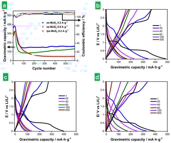 Long-term cyclability of ee-MoS2 and lpe-MoS2 electrodes on the basis of GCD measurements. (a) Gravimetric capacity (larger circles) and Coulombic efficiency (smaller circles) vs. cycle number for ee-MoS2 at 0.2 (blue color) and 0.5 A g−1 (green), and for lpe-MoS2 at 0.2 A g−1 (red). (b–d) GCD profiles recorded at different cycle numbers (indicated in the legends) for ee-MoS2 at (b) 0.2 A g−1 and (c) 0.5 A g−1 as well as for lpe-MoS2 at (d) 0.2 A g−1. The gravimetric capacities are calculated relative to the total mass of the electrode.