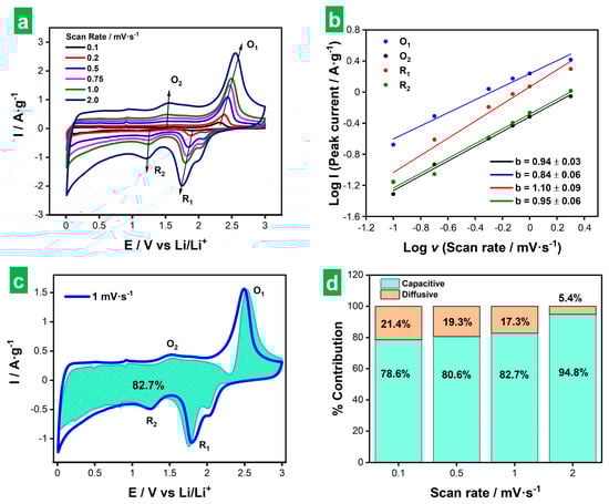 where i is the measured peak current at a given scan rate, ν, and a and b are adjustable parameters. A b value of 1 denotes purely (pseudo)capacitive charge storage processes that are not limited by diffusion, while a value of 0.5 indicates purely diffusion-controlled processes. b values in between these two extremes imply the occurrence of mixed (pseudo)capacitive and diffusion-controlled processes in different proportions [70]. The results of peak fitting are presented in Figure 9b. For the O1/R1 redox pair, the b parameters were calculated as 0.84 (O1) and 1.10 (R1). The latter was obviously artifactual and very likely stemmed from contributions of the shoulder peak observed in Figure 9a at the positive potential side of the R1 peak (i.e., in the 2.0–2.1 V region). The separation between the R1 and shoulder peaks tended to decrease with increasing ν, implying an increasingly large contribution of the shoulder peak to the R1 current and thus enhancing its b value. For the O2/R2 pair, the b values were 0.94 (O2) and 0.95 (R2). All these figures indicated charge storage in the ee-MoS2 electrode to comprise both (pseudo)capacitive and diffusion-limited processes, but with a very clear dominance of the former. Such a conclusion was reasonable, considering that these redox peaks were associated with Li2S/S8 and Li-PS conversion reactions, which are thought to be mainly surface processes and are consequently not or little affected by diffusion [53,54,71].
