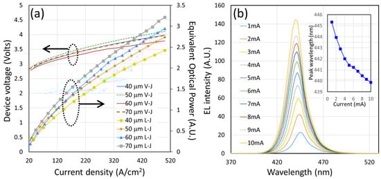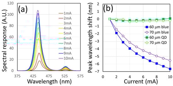 After the U-shape devices are fabricated, their spectra can be measured under different current levels. The devices can be probed on a wafer with a proper electrical and photo-detection setup, as we mentioned in Section 2. Figure 2a shows the light output and diode voltage versus injection current density of 10-micron mesa U-shape devices with different courtyard sizes. The larger the courtyard is, the higher the expected output power due to the larger light emission area. We would like to point out that the electrical isolation between the CQD layer and the U-shape diode was achieved by the dielectric layer covering the top surface of the semiconductor. This dielectric layer is the same passivation layer that we deposited during the ALD and PECVD steps and the total thickness is 430 nm. A further measurement of the devices before and after the CQD dispense shows that the diode series resistances are unaffected, which means good isolation between the CQD layer and the U-shape diode. This electrical isolation also ensures that our CQD layer does not receive any electrical injection and only receives the photonic excitation from the U-shape micro LED’s blue photons. The current-dependent spectra were also taken, as shown in Figure 2b. In Figure 2b, a blue shift in the peak wavelength can be observed and the difference (∆λ) of emission peaks can be as large as 5.5 nm between 1 mA and 10 mA. This phenomenon can be explained by the screening effect and the reduction of the inherent quantum-confined Stark effect (QCSE) or enhanced band-filling effects [21,22,23,24,25,26].