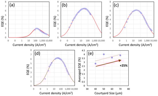 The measured EQE profiles vs. current density of U-shape micro LEDs whose mesa width is between 10 μm and 15 μm and whose courtyards are (a) 40 μm by 40 μm, (b) 50 μm by 50 μm [20], (c) 60 μm by 60 μm [20], and (d) 70 μm by 70 μm, respectively. (e) The averaged EQEmax for various courtyard sizes of U-shape micro LEDs. An increase of 25% can be observed between the 40 μm devices and the 70 μm devices.