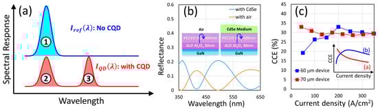 (a) An illustration of the CCE evaluation via the measured spectra of the devices with and without CQDs. (b) The calculated reflectance of the interface (between U-shape micro LED and air) with and without CQD deposition. This simulation was performed from the online tool https://www.filmetrics.com (accessed on 21 April 2024). The inset pictures depict the two structures: one with QDs (CdSe medium) and the other one with air. (c) The CCE under different currents for U-shape micro LEDs with 60 and 70 μm courtyard sizes [20]. The inset illustrates the two common patterns for EQE current-dependency.