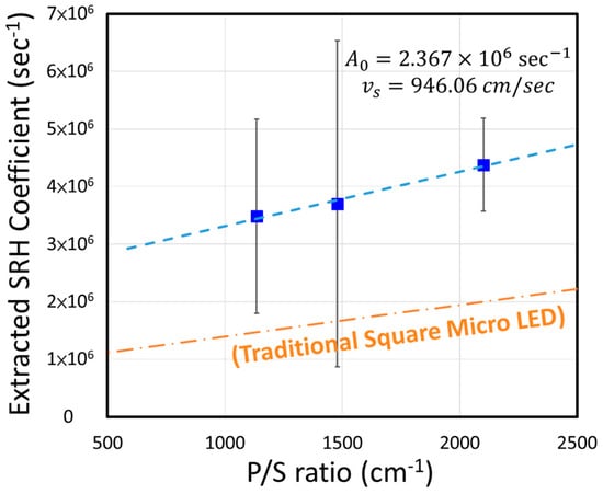 One of the drawbacks of the U-shape micro LEDs is its high ratio of the periphery over the device area (P/S ratio). The situation can often lead to the undesirable high rates of non-radiative recombination which can be seen from the extracted SRH coefficients (A coefficient in Equation (3)) under different device geometries. The effect of a high P/S ratio can be seen in the generic formula for the SRH coefficient [12,34,38]: