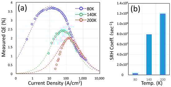 Following the analysis of the previous section, we saw high non-radiative recombination in our U-shape devices. If we can somehow suppress this mechanism, it is possible to see a positive change in the measured EQE. To test this assumption, one of the possible scenarios is to measure its EQE at low temperatures. A 10-micron-mesa U-shape device with a 70 μm × 70 μm courtyard is placed on a cryogenic stage and cooled down by liquid nitrogen. The EQE measured at various temperatures showed a very distinctive feature in Figure 7a. The EQE at 80 K showed a great boost to 3.7% and the Jpeak_EQE was around 13A/cm2. When the stage temperature was raised to 140 K and 200 K, we observed a reduction in the peak EQE (2.42% at 140 K, 2.00% at 200 K) and the increase of Jpeak_EQE (52.17 A/cm2 at 140 K, 152.17 A/cm2 at 200 K). By applying the modified ABC model, as we mentioned in Equation (3) [9], we can extract the corresponding SRH coefficients, as shown in Figure 3. The SRH coefficients grow exponentially from 3.57 × 106 s−1 at 80 K and 7.95 × 107 s−1 at 140 K to 1.20 × 108 s−1 at 200 K, and the results are plotted in Figure 7b. In the past, similar results were obtained in a large InGaN device [43], in which the increase of EQE and the shift of Jpeak_EQE were both expected.