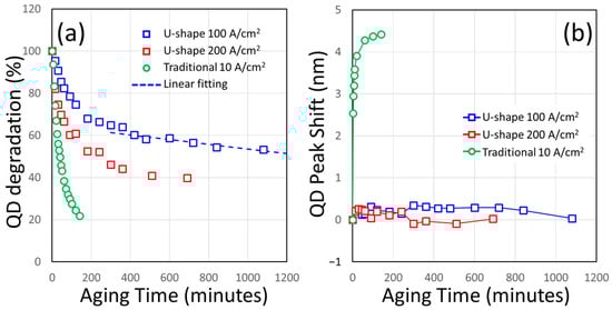 One of the merits that was brought by the U-shape micro LED is the better thermal distribution when CQDs are deposited in the courtyard area compared to the direct mesa top area of the traditional square devices. As shown in the Experimental Section, we perform the CQD dispense via the AJ inkjet-type of spray and we can drive the micro LED continuously to observe the change of CQD emission. The current density of the micro LEDs can be used as a standard for comparison. In Figure 8a, the CQD emission intensity versus aging time was shown for a directly dispensed CQD layer on a square device at 10 A/cm2, a 70 μm U-shape device at 100 A/cm2, and a 70 μm U-shape device at 200 A/cm2. The QD degradation was evaluated by the peak CQD intensity at the time of the measurement divided by the initial peak CQD intensity (at the 0th minute). So, in Figure 8, the degradation would begin at 100% and decrease as the aging test proceeds. The case with the square device can be named as the traditional or the reference sample. A time duration for the CQD peak intensity dropped to 50% of its initial value will be used to evaluate the effectiveness of the CQD layer. As we expected, the CQD emission in the traditional case dropped to 50% of the initial value in less than 40 min (at the 39th minute in the measurement) into the aging test, while the CQD peak of a U-shape device at 100 A/cm2 can last to 1321.26 min (by the linear extrapolation of the experimental data up to the 1080th minute) and 249.11 min at 200 A/cm2. The shift of the CQD emission in the traditional case is also large: more than 4.42 nm was recorded during the test, while both U-shape cases only moved slightly (0.033 nm at 100 A/cm2, 0.022 nm at 200 A/cm2), as shown in Figure 8b. Because the wavelength shift affects the perception of our eyes to the image quality, this illustrates another strength of our design: the color quality of a U-shape CQD device can be maintained even when the CQD is degrading. In other cases, the low-temperature ALD coating or the ionic crystal encapsulation can help protect the CQD layer and increase its life span greatly [36,45]. With proper handling, thousands of hours of CQD lifetime can be reached and this will be crucial for the success of this device in the next phase of development.
