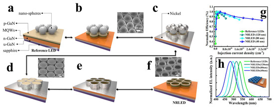 - Wang, S.W.; Hong, K.B.; Tsai, Y.L.; Teng, C.H.; Tzou, A.J.; Chu, Y.C.; Lee, P.T.; Ku, P.C.; Lin, C.C.; Kuo, H.C. Wavelength tunable InGaN/GaN nano-ring LEDs via nano-sphere lithography. Sci. Rep. 2017, 7, 42962. [Google Scholar] [CrossRef] [PubMed]