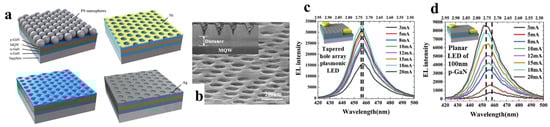 - Du, Z.; Chen, E.; Feng, H.; Qian, F.; Xiong, F.; Tang, P.; Guo, W.; Song, J.; Yan, Q.; Guo, T.; et al. Efficiency improvement of GaN-based micro-light-emitting diodes embedded with Ag NPs into a periodic arrangement of nano-hole channel structure by ultra close range localized surface plasmon coupling. Nanotechnology 2022, 33, 495202. [Google Scholar] [CrossRef] [PubMed]