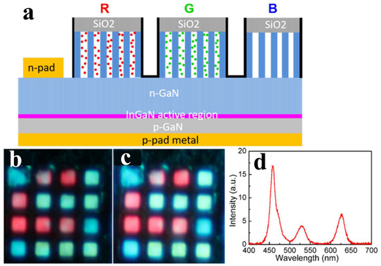 - Song, J.; Kang, J.-h.; Han, J. Monolithic RGB Micro-Light-Emitting Diodes Fabricated with Quantum Dots Embedded inside Nanoporous GaN. ACS Appl. Electron. Mater. 2021, 3, 4877–4881. [Google Scholar] [CrossRef]