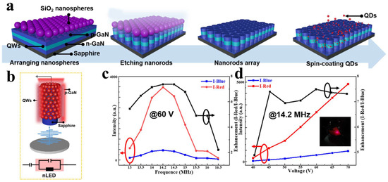 - Du, Z.; Wang, K.; Sun, J.; Guo, W.; Wu, C.; Lin, C.; Yan, Q. Ultrahigh color conversion efficiency nano-light-emitting diode with single electrical contact. IEEE Trans. Electron Devices 2023, 70, 1156–1161. [Google Scholar] [CrossRef]