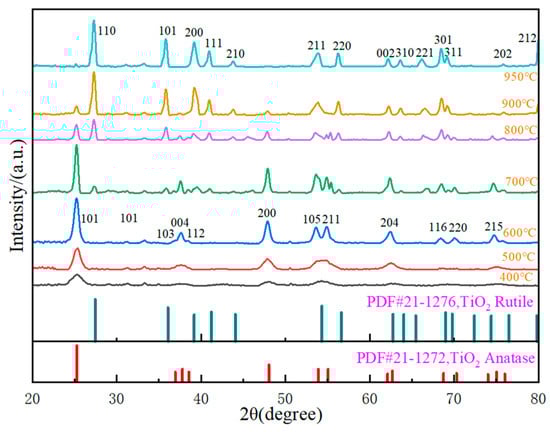 Due to the fact that the anatase phase of TiO2 has a higher density of localized states and surface-adsorbed hydroxyl groups, the photocatalytic performance of TiO2 in the anatase phase is generally better than that in the rutile phase. Hence, the focus of this study is mainly placed on the anatase phase of TiO2. The calcination temperature is an important factor that affects the phase transition and the morphology of TiO2 []. To obtain a highly crystalline anatase phase of TiO2, we first explored its phase transition temperature by in-situ XRD. The in-situ XRD pattern is shown in Figure 2. At the calcination temperature of 400 °C, the (101) crystal plane formed firstly in the anatase phase of TiO2 (JCPDS No. 21-1272). At this time, the diffraction peak of TiO2 was large and wide, and the crystallinity was low. When the temperature rose to 500 °C, all the characteristic peaks of TiO2 sample in the anatase phase appeared, and the 2θ value formed (103), (004), and (112) crystal planes around 38°. When the temperature rose to 600 °C, TiO2 samples presented the most significant characteristic peak in the anatase phase. At this time, the crystallinity of TiO2 was relatively high, and all of them were in anatase phases. When the temperature further rose to 700 °C, the (110) crystal plane began to appear in the rutile phase of TiO2 samples (JCPDS No. 21-1276), while the characteristic diffraction peak of the (101) crystal plane in the anatase phase began to weaken. This indicated that some TiO2 powder was transformed from the anatase phase to the rutile phase, which confirmed that the phase transition temperature of TiO2 was less than 700 °C. As the temperature further rose, increasing TiO2 samples were transformed from the anatase phase to the rutile phase. When the temperature reached 950 °C, all the characteristic peaks of TiO2 in the anatase phase disappeared, and the characteristic peaks of TiO2 in the rutile phase were significant and sharp. This indicated that the rutile phase of all TiO2 samples was formed, with high crystallinity.