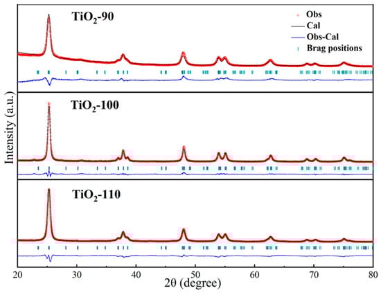 where D is the nanoparticle crystalline diameter, K represents the Scherrer constant and equals 0.89, λ is the X-ray wavelength (1.54 Å for copper K-α), and β denotes the full width at half maximum (FWHM). The average crystallite diameters of TiO2-90, TiO2-100, and TiO2-110 particles of 9.3 nm, 14.6 nm, and 18.1 nm were obtained from the analysis of the main reflections, respectively.
