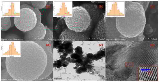 The morphology and surface nanoparticle diameter distribution (insert) of nanoporous TiO2 with hierarchical micro/nanostructures are shown in Figure 4. It can be seen from Figure 4a–d that the morphology of the synthesized TiO2 was spherical with a rough surface, and the surface was composed of numerous hierarchical nanocrystallites (size: 5–22 nm). As the reaction temperature rose, the spherical diameter of samples gradually increased, and the nanoparticles on the surface became larger and denser. The diameter of TiO2-90, TiO2-100, and TiO2-110 was about 300 nm (Figure 4a), 320 nm (Figure 4b), and 360 nm (Figure 4c), respectively. When the reaction temperature further rose at 130 °C, the diameter of TiO2-130 reached 500 nm (Figure 4d). This indicates the size of nano-porous TiO2 can be controlled by controlling the reaction temperature. This special hierarchical micro/nanostructure of nano-porous TiO2 is beneficial to the separation of photogenerated electron pairs and improve the photocatalytic performance []. The elemental mapping shows that TiO2 only has Ti and O elements, which is consistent with XRD analysis results (Figure S1).