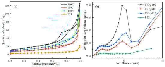 The BET-specific surface area and corresponding pore size distribution of synthetic TiO2 were analyzed by the N2 adsorption–desorption isotherm curve, as shown in Figure 5. Based on the IUPAC classification, the N2 adsorption–desorption isotherms of all synthesized samples can be classified into type IV adsorption isotherms, which correspond to ordered mesopores TiO2 []. Among them, TiO2-100 exhibited the H2 type hysteresis loop, indicating that the pore size distribution of mesopores in the material was relatively uniform. In contrast, TiO2-90 and TiO2-110 exhibited the H3 type hysteresis loop, indicating that the mesoporous structure of these materials was irregular [,] (Figure 5a). By comparing the specific surface area of these samples, it can be seen that the specific surface area (57 cm2/g) of TiO2-100 was much larger than that of TiO2-90 and TiO2-110, and it was 6.2 times that of commercial P25. The pore size distribution curve calculated by the BJH method further revealed that TiO2-100 had a mesoporous structure, and the particle size distribution was relatively concentrated, as shown in Figure 5b. The BET-specific surface area, pore volume, and average pore diameter of these synthesized samples are listed in Table S1. Compared with commercial P25, TiO2-100 exhibits a larger specific surface area and pore volume. The favorable specific surface area and internal pore structure are beneficial to the multiple reflection and refraction of light, thus boosting the utilization efficiency of light and raising the photocatalytic ability [,].