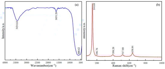 (a) The FTIR spectra of TiO2-100; (b) Raman spectra of TiO2-100.