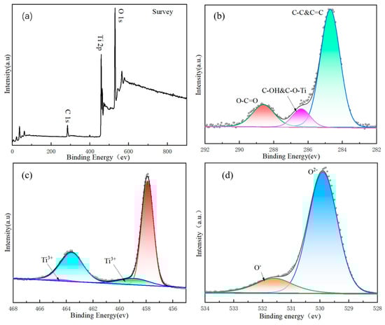 The distribution and valence state of elements on the surface of photocatalytic materials were explored by XPS technology, as shown in Figure 7. The survey XPS spectrum of TiO2-100 is shown in Figure 7a. The characteristic peaks of C 1s, Ti 2p, and O 1s can be observed from the spectrum, which indicates that the prepared sample contained C, O, and Ti elements. The C element may come from CO2 or C pollution adsorbed in the air (Figure 7b). Figure 7c presents the XPS spectrum of Ti 2p, when the FWHM of the deconvolution of the spectra was fixed at 1.1 eV, the percentages for Ti4+ 2p1/2, Ti4+ 2p3/2, Ti3+ 2p1/2 and Ti3+ 2p3/2 are 15.24%, 59.86%, 21.47% and 3.43%, respectively. It can be seen from the spectrum that the binding energies at 463.2 eV and 457.9 eV corresponded to Ti4+ 2p1/2 and Ti4+ 2p3/2, which corresponded to the Ti4+-O bond in TiO2 []. Similarly, the peaks at 464.0 eV and 458.5 eV binding energies corresponded to Ti3+ 2p1/2 and Ti3+ 2p3/2. The main function of Ti3+ was to balance the charge surplus caused by oxygen vacancies. In the high-resolution O1s diagram (Figure 7d), it can be observed that the oxygen spectrum had the main peaks with binding energies at 529.9 eV and 531.6 eV, which corresponded to the characteristic peaks of the Ti-O bond and surface hydroxyl oxygen (OOH), respectively [,,,,].