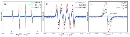 We used the EPR characterization technology to further study the reactive oxides and oxygen vacancy generated by the synthetic samples under light, and the EPR spectrum is shown in Figure 8. Figure 8a,b are, respectively, the EPR spectra of hydroxyl radicals and superoxide radicals generated by the samples after irradiation with visible light for 1 min. Figure 8a,b show that all the synthesized samples produced hydroxyl radicals and superoxide radicals after irradiation, which are the main active species for TiO2 to degrade pollutants. Under the same test parameters, TiO2-100 has higher signal intensity than TiO2-90 and TiO2-110, indicating that TiO2-100 generates more hydroxyl radicals and superoxide radicals and is more efficient in photocatalysis []. Figure 8c is the oxygen vacancy EPR spectrum of the synthetic samples. It can be seen from the results that all samples have significant characteristic peaks at the position where the g value is 2.003, which indicates the existence of oxygen vacancies in the samples. These may be due to the combination of Ti3+ on the surface of the sample and oxygen in the air or water, and the existence of oxygen vacancies is beneficial to the oxidation and reduction processes in photocatalytic reactions. This is consistent with the XPS analysis results. Moreover, the oxygen vacancy signal intensity of TiO2-100 is stronger than that of TiO2-90 and TiO2-110, indicating that TiO2-100 may have more oxygen vacancies [,].