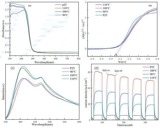 The UV–vis diffuse reflectance spectra of catalysts were examined to evaluate the optical properties of these samples, with the results shown in Figure 9a,b. It can be seen from Figure 9a that the samples prepared at different reaction temperatures and P25 had similar absorption spectra. Both in the ultraviolet region (λ < 400 nm) had strong absorption, which was mainly attributed to the band gap (3.2 eV) excitation of TiO2 in the anatase phase. As shown in Figure 9b, it can be calculated based on the Kubelka Munk function [] that the band gap of these TiO2 samples was about 3.08 ev, and that of P25 was about 3.12 ev [,,].