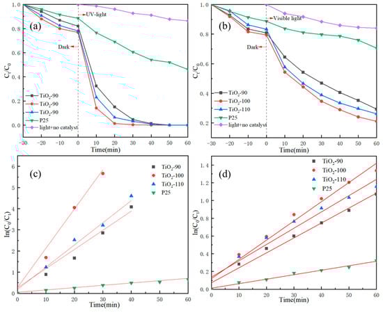 The photocatalytic activity of the catalyst to degrade antibiotic TC was evaluated under UV and visible light irradiation, with the results shown in Figure 10. It can be seen from Figure 10a that under UV-light irradiation, in the absence of catalysts, the TC concentration remained unchanged with the increase of irradiation time. This result indicated that the photolysis of TC was negligible in the absence of TiO2. Additionally, before the irradiation under a light source, all of these synthesized TiO2 samples could adsorb TC in the dark within 30 min, and the adsorption rate was about 20%, which was similar to the research result of Wu []. Moreover, under the irradiation of simulated sunlight, the degradation of TiO2-100 to TC was the fastest and most thorough, and TC could be completely removed within 30 min. The TC degradation rate of TiO2-90 and TiO2-110 was also nearly 100% after 50 min, while that of P25 only reached 54% after 60 min under light irradiation, which was in stark contrast to the degradation efficiency of TiO2-100.