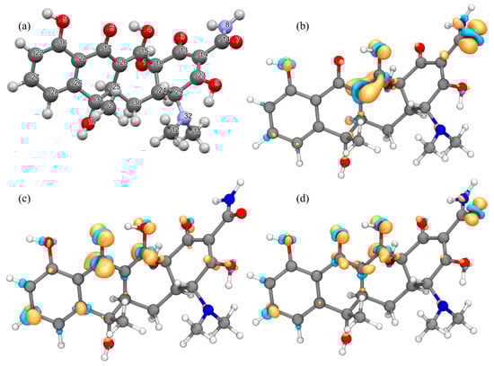(a) Optimized structure of TC molecular; (b) The sites prone to electrophilic reactions; (c) The sites prone to nucleophilic reactions; (d) The sites prone to free radical reactions.