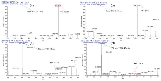 The intermediates formed during the degradation of TC were analyzed using HPLC-MS. Figure 12 presents the HPLC-MS spectrum recorded by TC in the TiO2-100 system under different UV irradiation time lengths. It can be seen from the figure that when the residence time (RT) was 10.4 min, the peak corresponding to the specific charge (m/z) of TC at 445 gradually decreased, and basically disappeared after 30 min. This finding was consistent with the results obtained in the analysis of Figure 10a. At the same time, a large number of new small molecule fragments appeared, and they were all intermediates formed in the degradation process. After identification, the possible intermediates were named P1–P10 and listed in Table S4.