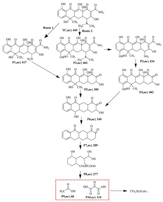 Through the calculation of the above Fukui function, the carbon–carbon double bond, phenolic hydroxyl group, and amino group of the TC molecule can be revealed [,,,]. These high-electron density structures will be preferentially attacked by active oxide species. Combining the degradation intermediates detected by LC-MS and the results of theoretical calculations, we proposed two possible degradation pathways of TC in the TiO2-100 reaction system, as shown in Figure 13. In terms of the first pathway on the left, TC was first attacked by reactive species and lost two methyl groups to form intermediates P1 (m/z = 417). In terms of the second path, the carbon–carbon double bond (C28) of TC was attacked by the nucleophile substances to form an intermediate P2 (m/z = 462) through hydroxylation. The intermediate P2 can form P3 (m/z = 434) through demethylation under the action of active oxidative species. The intermediates P1 and P3 can also form P4 (m/z = 402) and P5 (m/z = 385) through deamidation. The O1 and O4 sites of P4 and P5 were attacked by active components, and the carbon–carbon double bonds at C15 and C20 sites were also destroyed to generate intermediates P6 (m/z = 340). Active species further attacked the C16, C25, and C31 sites for dehydroxylation to form intermediates P7 (m/z = 289). Subsequently, the carbon–carbon double bonds at C16, C17, C26, and C27 were attacked by active oxide species and to generate a carboxyl group through the ring-opening reaction, thus forming P8 (m/z = 277). Finally, it generated P9 (m/z = 60) and P10 (m/z = 118) after decarboxylation. These intermediates will eventually be mineralized into small molecule harmless products such as CO2 and H2O [,,].