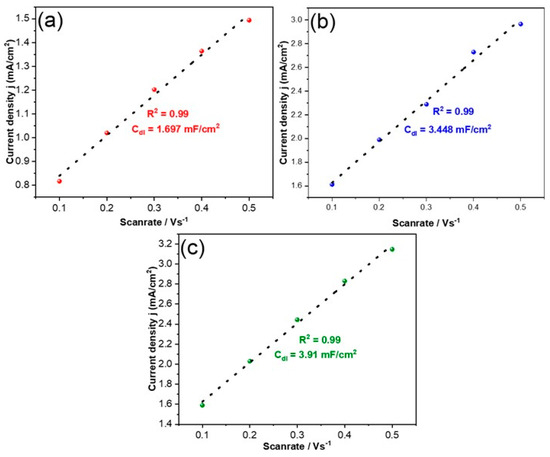 Determination of the electrochemical double layer capacitance using linear correlation plots between non-Faradaic current density and scan rates for (a) Co@Cu-10, (b) Co@Cu-20, and (c) Co@Cu-30.