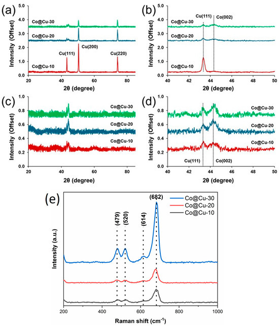 X-ray diffractograms for DHBT-synthesized cobalt electrocatalysts on different substrates (a) on copper substrates in the 2θ range from 20 to 85 degrees, (b) on copper substrates in the 2θ range from 40 to 50 degrees, (c) on glass substrates in the 2θ range from 20 to 85 degrees, (d) on glass substrates in the 2θ range from 40 to 50 degrees, and (e) Raman spectra of cobalt electrocatalysts collected using a 532 nm laser.