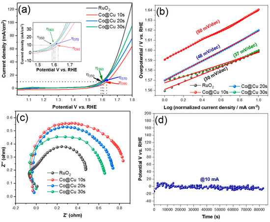 The charge transfer kinetics and resistance characteristics of the synthesized electrocatalysts were evaluated using AC impedance spectroscopy [63] and the results are depicted in Figure 5c. The measured impedance for the different samples increased in the following order: RuO2 (0.47 ohm) < Co@Cu-30 (0.65 ohm) < Co@Cu-20 (0.73 ohm) < Co@Cu-10 (0.83 ohm). These results clearly highlighted that electrocatalyst impedance could be inversely correlated with their OER activities and the RuO2 reference electrode exhibited the lowest impedance and the highest OER activity. The lower impedance was indicative of superior charge transfer kinetics and lower resistance to electrochemical processes in the reference RuO2 electrode. Comparatively, all DHBT-synthesized cobalt electrocatalysts exhibited higher impedance values with the least impedance values exhibited by Co@Cu-30. The electrical properties of the DHBT-synthesized cobalt electrocatalysts were governed by the thickness of these films and the fraction of metallic cobalt content in their bulk. The characterization studies revealed that the surface of the DHBT-synthesized cobalt electrocatalysts were completely covered with Co(OH)2 while the bulk contained Co3O4 in the cubic phase which were assigned as the active sites for the OER reaction in agreement with previous studies [24,55,56]. The role of metallic cobalt present in the bulk of the DHBT-synthesized electrocatalysts was to facilitate electron transport and act as a current collector. The Co@Cu-30 electrocatalyst which had the highest cobalt content exhibited lower impedance due to the presence of an efficient conducting underlayer compared to other electrocatalysts. The long-time stability test for Co@Cu-30 electrocatalyst at 10 mA cm−2 for 24 h is depicted in Figure 5d. This stability test clearly indicated that the potential of the Co@Cu-30 electrocatalyst and its electrocatalytic activity was stable throughout the test.