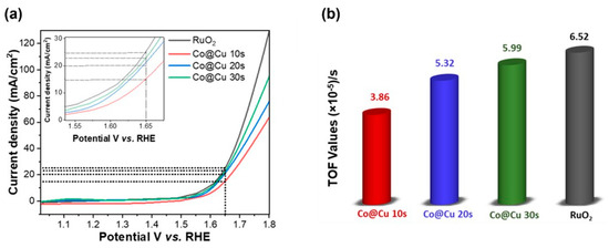 To compare the intrinsic reaction kinetics, the turnover frequencies (TOF) were calculated from current densities determined at a constant potential of 1.65 V vs. reversible hydrogen electrode in 1 M NaOH solution using the equation described on page 4 of the Supplementary Materials [64]. The turnover frequencies increased in the following order: RuO2 (6.52 × 10−5 s−1) < Co@Cu-30 (5.99 × 10−5 s−1) < Co@Cu-20 (5.32 × 10−5 s−1) < Co@Cu-10 (3.86 × 10−5 s−1) as shown in Figure 6. These results clearly highlight the significantly higher electrocatalytic activity of Co@Cu-30 compared to Co@Cu-10 and Co@Cu-20 electrocatalysts. While the presence of macropores distributed in a honeycomb-like network was a common feature of all the electrodeposited catalysts, the presence of cobalt nanosheets in Co@Cu-30, its high electrochemically active surface area (Cdl), superior impedance characteristics, and high cobalt content were responsible for its superior electrocatalytic activity. The hierarchical porosity observed in Co@Cu-30 allowed easy diffusion of hydroxide anions to the active sites and facile transport of the evolved oxygen away from the electrodes. The higher cobalt content of Co@Cu-30 electrocatalyst contributed towards the lower impedance and better charge transfer characteristic of this electrocatalyst. The performance of hierarchically porous cobalt electrocatalyst (Co@Cu-30) synthesized in this research was benchmarked against other cobalt electrocatalysts reported in the literature for OER as shown in Table S2. It was clear from this comparison that the porous cobalt nanosheets exhibited a lower overpotential compared to some reported cobalt oxide, phosphide, sulphide, and selenide electrocatalysts.
