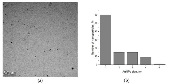 TEM was applied to determine the size of the AuNPs. According to Figure 1, AuNPs with a size of 1–5 nm are uniformly distributed in solution and do not form aggregates.