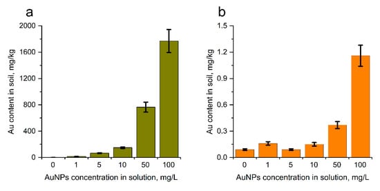 The content of gold in the control soil used for experiments was 0.09 mg/kg. Watering of soil with AuNPs solutions of different concentrations resulted in the direct increase in gold content in soil. Thus, at AuNPs concentration of 1 mg/L it constituted 15.2 mg/kg, while at the highest concentration of 100 mg/L, levels reached 1769 mg/kg (Figure 2a). Previously, Malejko et al. [34] showed that AuNPs were accumulated in roots, stems, and leaves of potato plants, with a much higher concentration remaining in the soil. The same finding was reported by [35].