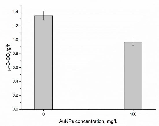 Soil is the largest receptor for the NPs and their effect on soil depends on NPs concentration, soil type, and enzymatic activity of soil [37]. Investigating the effect of NPs on the activity of dehydrogenase, urease, acidic, and alkaline phosphatase in two soils [38] showed that, depending on the enzyme and soil type tested, an inhibitory or a stimulating effect of NPs on the activity of the enzymes can be observed. In the present study, the soil respiration rate in the sample watered with AuNPs was 28% lower than in the control (Figure 3). This inhibition effect on soil microbial activity was statistically significant and implied potential environmental risks resulting from AuNPs’ accumulation in soil. Further research into the nature and extent of the impact of AuNPs’ accumulation on soil microbial activity is necessary to prevent long-term negative consequences of soil pollution by AuNPs on soil health.
