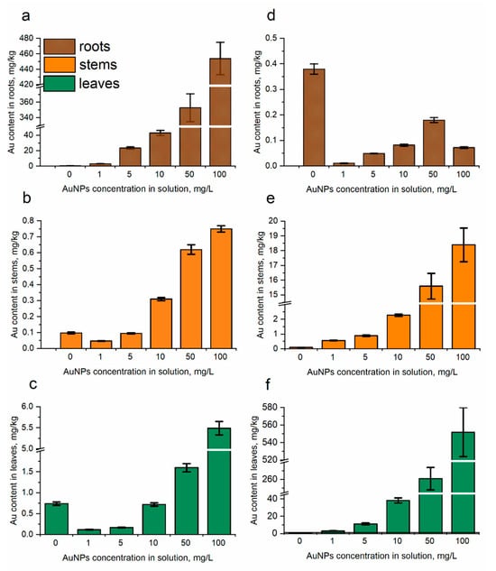 The content of gold in spearmint’s segments: (a–c) under root irrigation condition and (d–f) foliar spraying with AuNPs determined via k0-NAA (NPs concentrations 1–100 mg/L, duration of experiment 28 days).