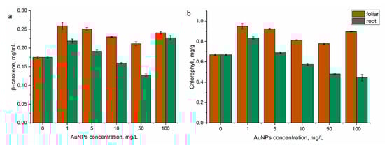 Change in the content of (a) β-carotene and (b) chlorophyll under the action of AuNPs (root and foliar treatment).