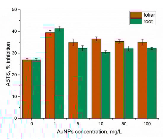 Spraying of mint plants with AuNPs in the concentration range of 5–100 mg/L led to an increase in antioxidant activity of 39.4–35.4%. Watering of plants with nanoparticles showed a more modest increase in the antioxidant activity values, by 12.7–19.4% compared to control. AuNPs increased the antioxidant activity of Nardostachys jatamansi plants treated [49].