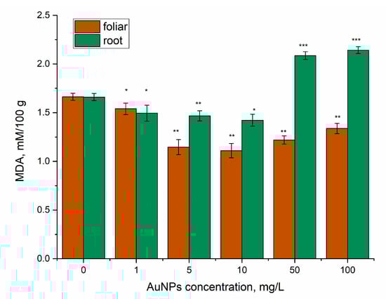 The content of malondialdehyde in mint leaves under action of AuNPs (root and foliar exposure). * p < 0.05; ** p < 0.005; *** p < 0.001.