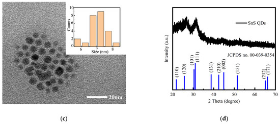 The optical properties, morphology, and crystal structure of SnS QDs were characterized, with the results presented in Figure 1. Examination of Figure 1a,b reveals that the QDs demonstrate significant absorption within the visible light spectrum. The Tauc plot indicates a direct bandgap value of 1.88 eV. The TEM image shows that the QDs feature a narrow size distribution with an average diameter of 7.15 nm, as shown in Figure 1c. XRD analysis of the sample is illustrated in Figure 1d. Due to the small size of the quantum dots, the peaks are broad and weak, which makes it difficult to analyze their shape and position. However, peaks are present near the (110), (120), (101), and (111) positions of the orthorhombic phase (JCPDS no. 00-039-0354), which is a strong indication that the SnS QDs exhibit this lattice structure. In summary, our study successfully replicated synthesis and yielded high-quality SnS QDs [39,40].