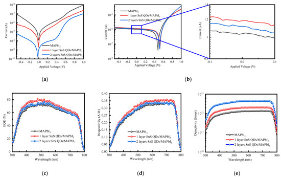 With an increase in the number of quantum dot modifications, the device exhibits an initial increase followed by a subsequent decrease in photocurrent. The photocurrent increases from 1.03 μA to 1.18 μA and 1.12 μA after one and two quantum dot modifications, respectively. This is attributed to the concurrent absorption of visible light by both the perovskite and SnS QDs, followed by their individual transport enabled by the intrinsic electric field, resulting in enhanced harnessing of visible light. SnS QDs exist on the back surface of perovskite materials and do not affect the absorption of incident light by perovskite. SnS QDs have a high absorption coefficient, which is beneficial for them to reabsorb the unabsorbed photons of perovskite. However, the photocurrent decreases when double layers of SnS quantum dots are applied. This reduction may be attributed to an increased amount of organic ligands within the quantum dot layer as well as the induction of defects from partial ligand detachment from the quantum dot surface during the heating process. Additionally, the excessive occurrence of tin vacancies leads to an increase in defect states. Due to the further decrease in device performance after coating with more layers of quantum dots, which is consistent with the above reasons, further layer quantum dot photodetector testing was not conducted. Furthermore, quantum efficiency was performed on the three devices, evaluating their responsivity and the correlation between the spectral detectivity and the wavelength of incident light. As the wavelength increases, the external quantum efficiency (EQE) exhibits a rising trend before subsequently declining in Figure 4c. Specifically, under illumination at 500 nm, the EQE reaches approximately 80%. However, devices incorporating two layers of quantum dots exhibit decreased EQE. This can be attributed to the incorporation of additional quantum dots bound with long-chain organic ligands, which significantly impedes photocurrent transport [50]. The device featuring a single layer of QDs maintains a responsivity of approximately 0.35 A/W across the wavelength range of 550~720 nm, as shown in Figure 4d.