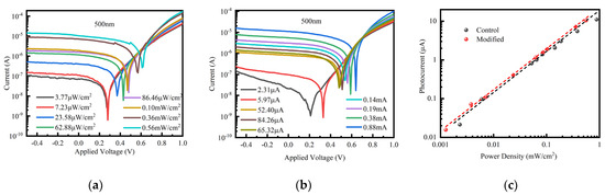 Figure 4a,b illustrate the current-voltage (I-V) characteristics of the three devices both in darkness and when exposed to 500 nm wavelength illumination at an intensity of 62 µW/cm2. The increasing number of interface quantum dot modifications correlates with a decreasing trend in the dark current at 0 V bias. Specifically, the dark current measured at 0 V bias in the pristine device is 1.16 × 10−8 A; after being modified by QDs once and twice, respectively, the dark current values decrease to 5.64 × 10−9 A and 1.08 × 10−9 A, respectively. The observed reduction in dark current is attributed to the application of quantum dot coating, which serves to passivate the surface dangling bonds of the perovskite. The elimination of surface ligands and the subsequent pairing of dangling bonds on the QD surface suppress thermal excitation in the dark state, thereby reducing the dark current. Additionally, the conduction band minimum of the quantum dot layer is positioned above that of the perovskite, and this difference in energy levels serves to inhibit the reverse migration of electrons [48,49]. The reduction in dark current can be analyzed using the Shockley equation.