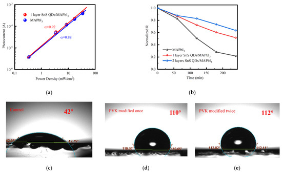 Compared to devices with the same structure, the photodetector in this work has higher responsivity and detectivity in Table 1. In addition, device stability is a critical factor influencing applications. Perovskite materials will quickly decompose into lead iodide when in contact with water, which will cause them to lose their photoelectric response characteristics. Conducting hydrophobic angle testing on it is an indirect method to test its water stability. As demonstrated in Figure 6c–e, by applying a coating of QDs, we successfully enhanced the device surface hydrophobicity. Following the application of single and double layers of QDs, the contact angles on the device’s surface increased to 110° and 113° from 43°, respectively. The increase in hydrophobic angle indicates that the surface of the device has a repulsive effect on water, making it difficult for water vapor to enter the interior of the device. This demonstrates that QDs modification significantly enhances the device hydrophobicity, inhibiting water decomposition reactions and improving the device wet stability. To verify its results, we conducted stability tests on it in 33 °C, 93% RH environments. From Figure 6b, it can be seen that with the increase in time, the performance of the basic device decreases the fastest. After 240 min, the optimized device still maintained 50% of its initial performance, while the performance of the basic device decreased to 20% of its initial performance. This can be attributed to the intrinsically high hydrophobicity of the SnS material, effectively decelerating water vapor diffusion, protecting the perovskite layer, and augmenting the device stability [53,54]. The hydrophobicity of SnS quantum dots may be due to capillary effects counter-balance bulk properties. Compared to optoelectronic devices optimized through P3HT, the performance degradation is almost the same (a 10% decrease in current exposed to 90% RH) [55].