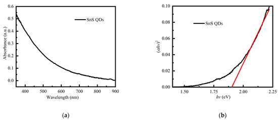 The optical properties, morphology, and crystal structure of SnS QDs were characterized, with the results presented in Figure 1. Examination of Figure 1a,b reveals that the QDs demonstrate significant absorption within the visible light spectrum. The Tauc plot indicates a direct bandgap value of 1.88 eV. The TEM image shows that the QDs feature a narrow size distribution with an average diameter of 7.15 nm, as shown in Figure 1c. XRD analysis of the sample is illustrated in Figure 1d. Due to the small size of the quantum dots, the peaks are broad and weak, which makes it difficult to analyze their shape and position. However, peaks are present near the (110), (120), (101), and (111) positions of the orthorhombic phase (JCPDS no. 00-039-0354), which is a strong indication that the SnS QDs exhibit this lattice structure. In summary, our study successfully replicated synthesis and yielded high-quality SnS QDs [39,40].