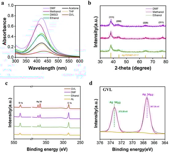 (a) UV-vis spectra, (b) X-ray diffraction (XRD) spectra, (c) X-ray photoelectron spectroscopy (XPS) spectra, and (d) high-resolution XPS survey scan of Ag 3d orbital for the synthesis of AgNPs@AL using lignin dissolved in various solvents.