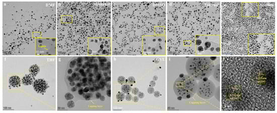 Morphologies of AgNPs@AL generated from different solvent systems are depicted. (a–j) TEM images illustrate air-dried, solvent-free suspensions after dialysis prepared from DMF, methanol, DMSO, ethanol, acetone, THF, and GVL solvent systems, while (f) presents AgNPs@AL crystal faces (111) and (220).