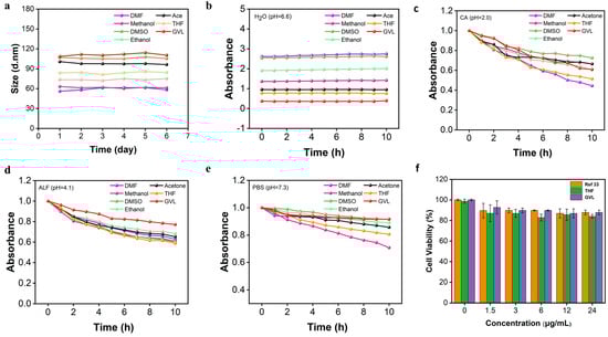 To assess the storage stability of AgNPs@AL, changes in particle size over time were monitored using dynamic light scattering (DLS). As depicted in Figure 3a, the particle size of AgNPs@AL remained largely unchanged over several days, suggesting favorable storage stability across samples synthesized using seven different organic solvents. Furthermore, to examine the dissolution behavior of AgNPs, AgNPs@AL was dissolved in various biological media, and alterations in the UV-Vis absorption peak of the nanosilver surface plasmon resonance (SPR) were tracked using a UV-Vis spectrophotometer according to the previous report []. As illustrated in Figure 3b, the characteristic absorption peak of nanosilver in H2O exhibited minimal change, indicating robust stability with minimal oxidation and release of silver ions. However, as demonstrated in Figure 3c, the dissolution rate of Ag+ was most rapid in the CA system. The dissolution rate of AgNPs in the seven samples decreased sequentially with increasing pH values. This dissolution behavior correlates with the oxidation state of nanosilver, where higher oxidation states correspond to faster dissolution rates. The strong acidity of the CA system promotes oxidation of Ag0 to Ag+, resulting in accelerated dissolution. Conversely, as pH increases, the oxidation capacity of the solution diminishes, leading to reduced dissolution rates of nanosilver (Figure 3d–f).