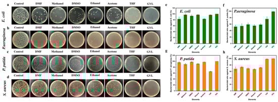 The antibacterial activities of the AgNPs@AL aqueous dispersion prepared from lignin solution with different solvents were evaluated using the plate counting method. Initially, E. coli, P. aeruginosa, P. putida, and S. aureus were exposed to AgNPs@AL at identical concentrations. To visually demonstrate the bactericidal effect, live bacterial colonies on solid nutrient agar plates exposed to different AgNPs@AL formulations for 1 h were photographed, and the bactericidal rate curve of AgNPs@AL was plotted based on colony counts. As depicted in Figure 4a, compared to the control group, the number of E. coli colonies in the experimental group was reduced, with no bacterial growth observed on the GVL plate, indicating effective bactericidal action of the AgNPs synthesized with seven different organic solvents against E. coli. Correspondingly, as shown in Figure 4e, the bactericidal rates of AgNPs@AL produced from DMF, methanol, DMSO, ethanol, acetone, GVL, and THF solvent systems against E. coli were 82.86%, 97.35%, 93.37%, 97.14%, 83.06%, 96.73%, and 100%, respectively, further underscoring the outstanding antibacterial efficacy of these seven nanosilver formulations against E. coli. Similarly, as depicted in Figure 4b–d, the number of colonies of P. aeruginosa, P. putida, and S. aureus in the experimental group was reduced compared to the control group. Figure 4f–h further illustrates the excellent antibacterial activity of AgNPs@AL produced from DMF, methanol, DMSO, ethanol, acetone, GVL, and THF solvent systems against P. aeruginosa, P. putida, and S. aureus. Additionally, it was observed that all nanosilver formulations exhibited superior antibacterial activity against Gram-positive bacteria compared to Gram-negative bacteria, likely attributable to differences in cell wall composition between the two bacterial types [].