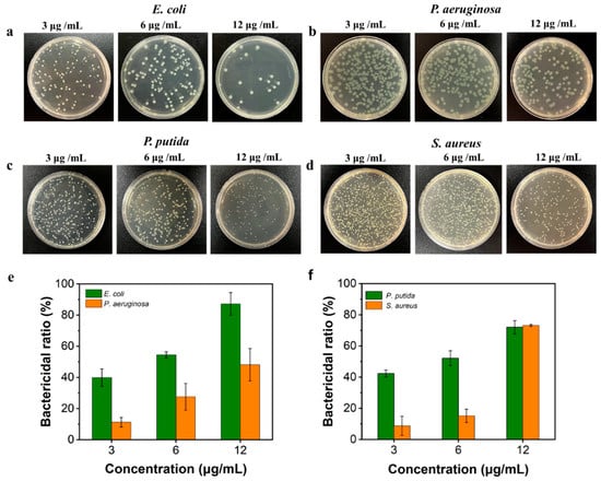 Incubate (a) E. coli (b) P. aeruginosa, (c) P. putidis (d) S. aureus for 24 h with different doses of AgNPs@AL. Activity determination of (e) E. coli and P. aeruginosa and (f) P. putidis and S. aureus at different AgNPs@AL concentrations.