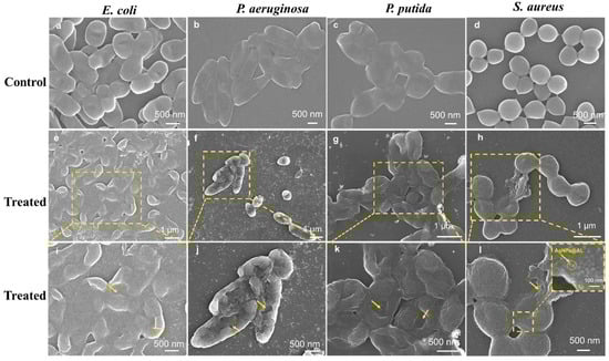 The SEM micrographs of E. coli, P. aeruginosa, P. putida, and S. aureus after incubation with PBS (control) (a–d) and AgNPs@AL (treated) (e–l) for 5 h at 37 °C. (i–l) are the magnified views of the yellow dashed regions in (e–h), respectively. Note: Bacterial membrane destruction is indicated by a yellow arrow.