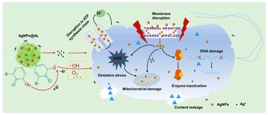 Drawing from prior research on the antibacterial mechanisms of lignin-based silver nanocomposites, several factors contribute to their antimicrobial activity. In addition to the established size-dependent effect, oxidative stress induced by reactive oxygen species (ROS) plays a pivotal role in bacterial inactivation. ROS generation can result from various pathways, including silver ion release and quinone/semiquinone free radical formation, subsequently yielding active oxygen species []. Both ROS and silver ions may enter bacterial cells, inducing oxidative stress and cell death. Therefore, we propose the following hypothetical antibacterial mechanism for AgNPs@AL, illustrated in Figure 8. The cell membrane of bacteria is directly damaged by AgNPs@AL, leading to permeability loss. Slow, sustained release of silver ions then disrupts mitochondria, inhibiting ATP production and causing DNA damage, enzyme inactivation, and ROS generation, affecting cellular components. These collective actions contribute to the antimicrobial efficacy of AgNPs@AL, ultimately resulting in bacterial demise [].
