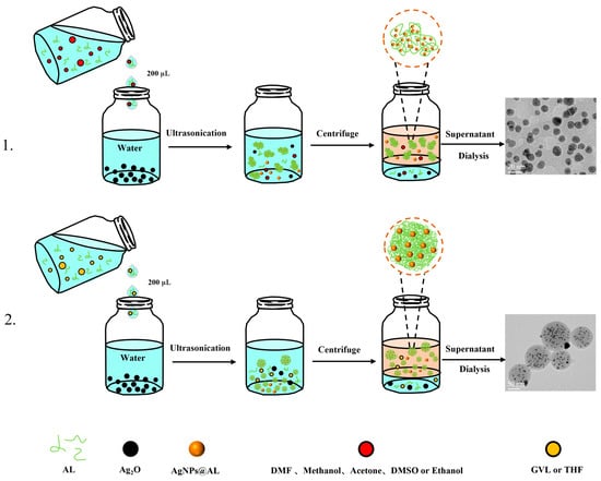 Scheme 1 illustrates the synthesis process of AgNPs@AL. In a specific experiment, 40 milligrams of alkaline lignin (AL) were dissolved in 1 mL of a binary solvent consisting of organic solvent and water in a 4:1 (v/v) ratio. The organic solvents utilized included dimethylformamide (DMF), methanol, dimethyl sulfoxide (DMSO), ethanol, acetone, tetrahydrofuran (THF), and γ-valerolactone (GVL), respectively. Subsequently, 0.2 mL of the AL solution was added dropwise to 1 mg/mL of silver oxide (Ag2O) aqueous suspension while subjected to ultrasonic irradiation at 360 W for 5 min (Product Model: Biosafer 900-92). Following the reaction, unreacted components were separated by centrifuging at 2000× g for 10 min to remove the excessive Ag2O. The supernatant was then dialyzed to obtain purified AgNPs@AL. In Scheme 1, the first row represents the synthesis process of nanosilver prepared using lignin dissolved by organic solvent systems of DMF, methanol, DMSO, ethanol, and acetone, respectively. On the other hand, the second row in the same figure indicates the synthesis process of nanosilver prepared using lignin dissolved by organic solvent systems of GVL or THF.